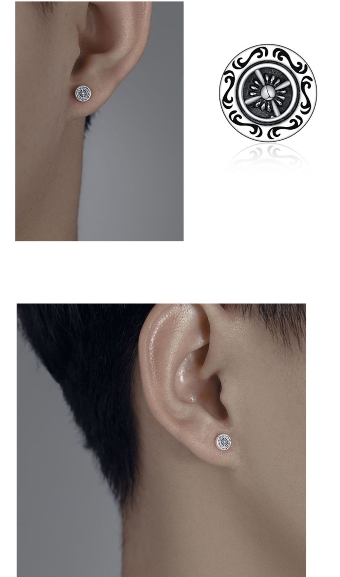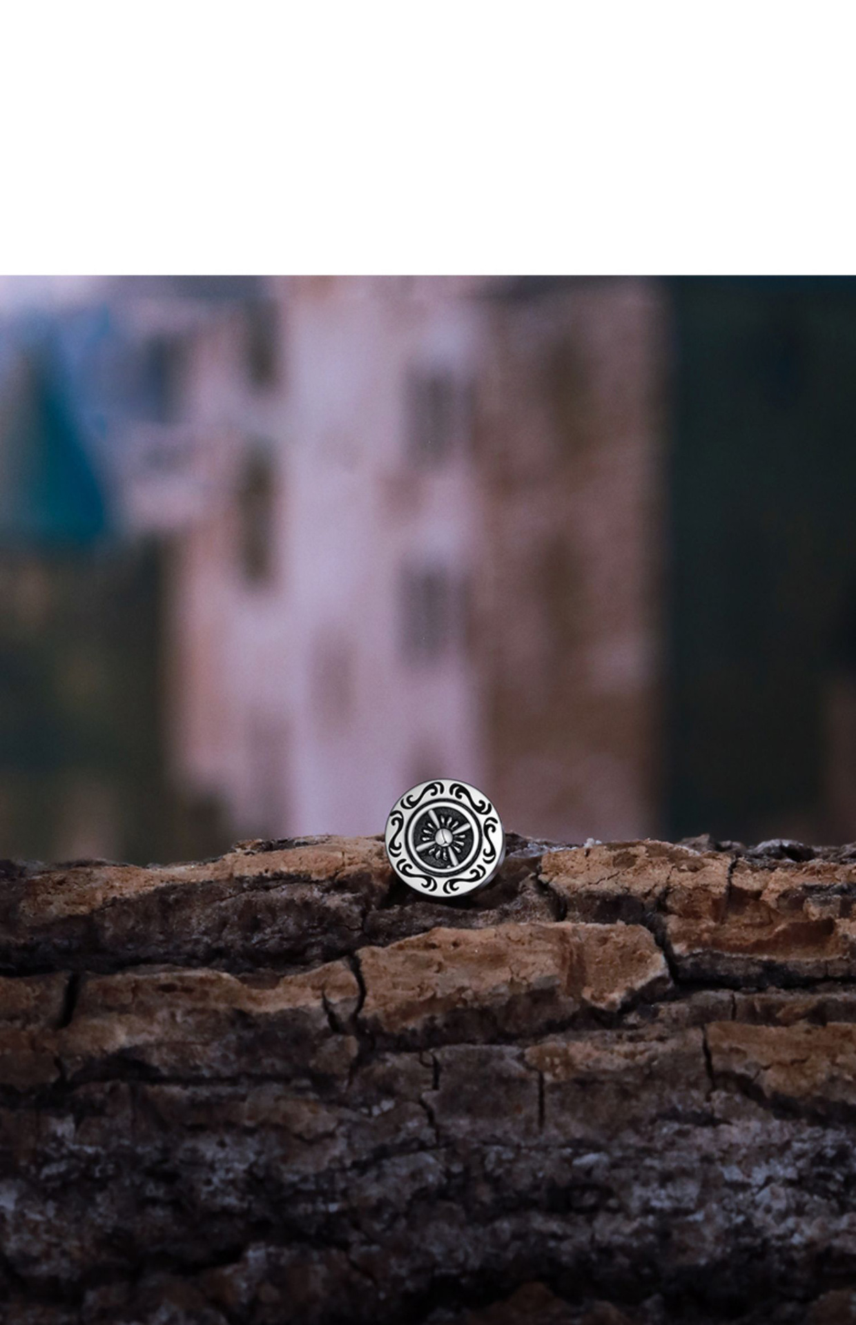 繊細な唐草模様が施された円形のメンズピアスです。片耳用のスタッドタイプで、中央には太陽のようなモチーフが彫り込まれ、周囲を流れるような曲線の装飾が囲んでいます。